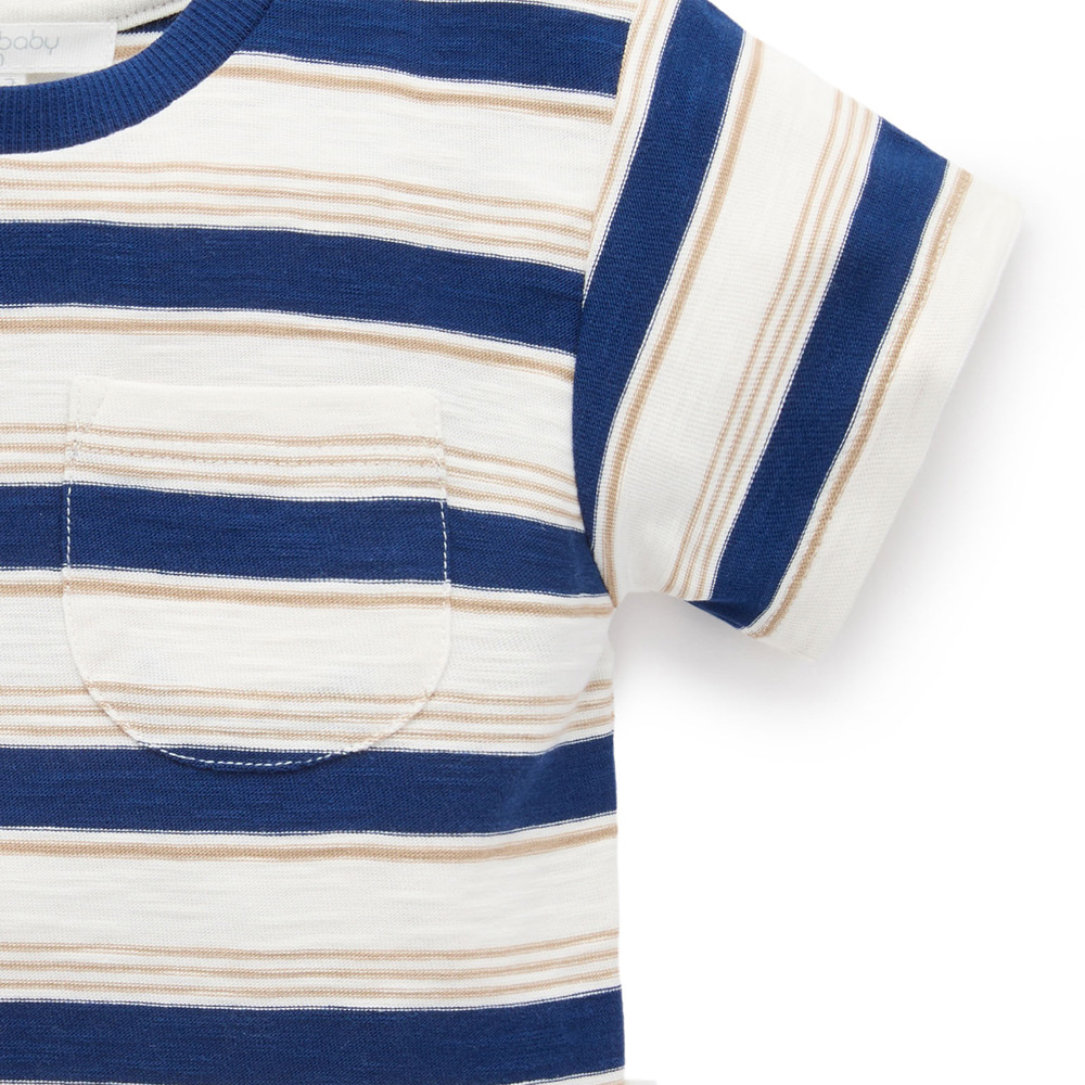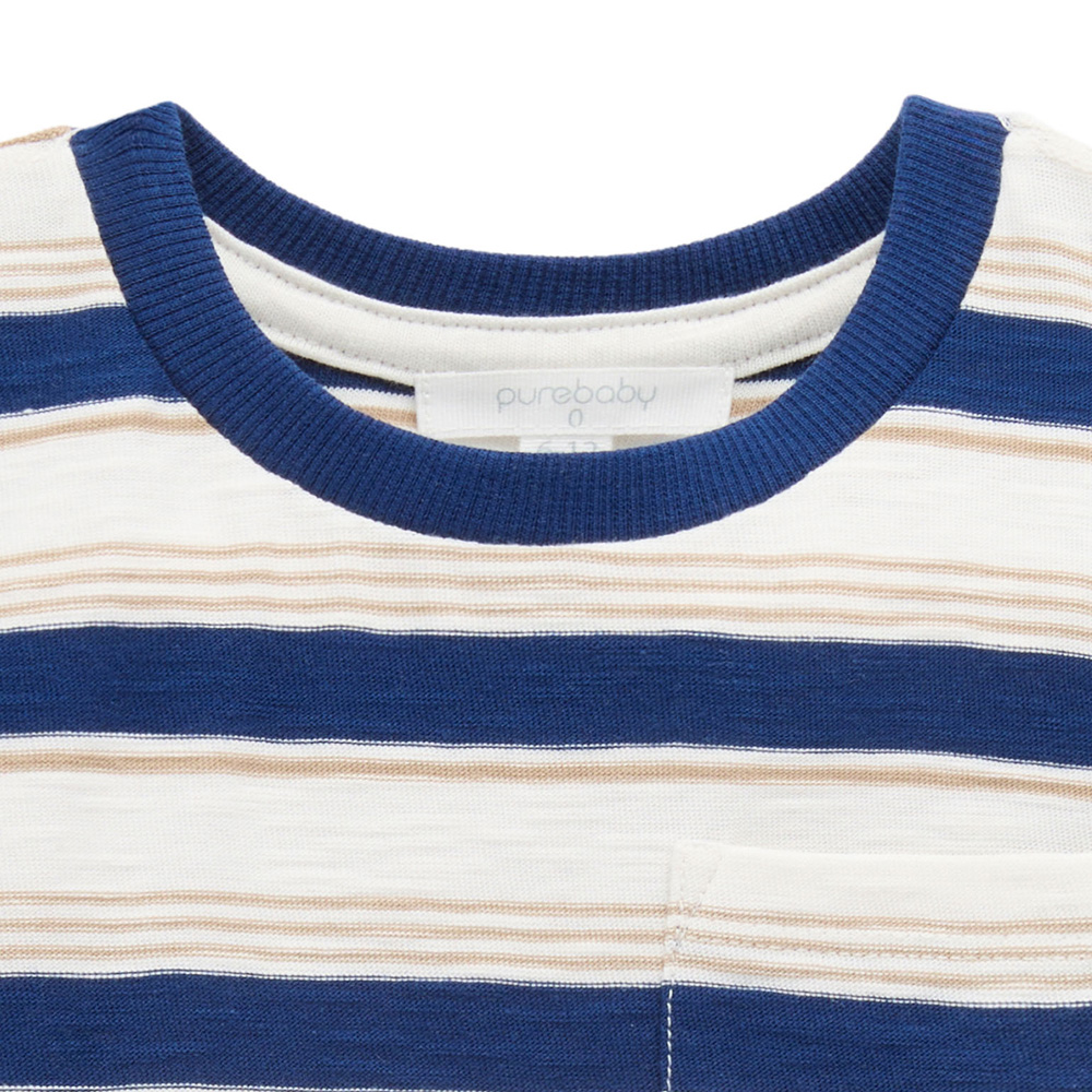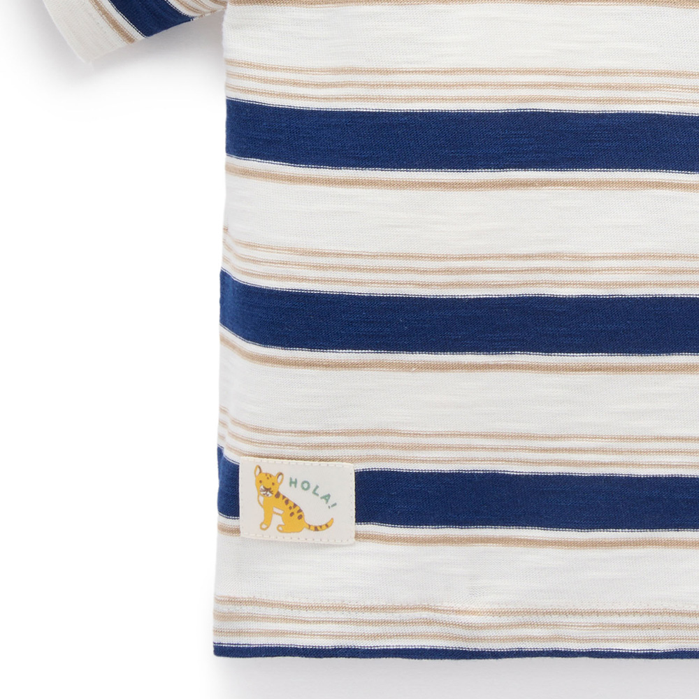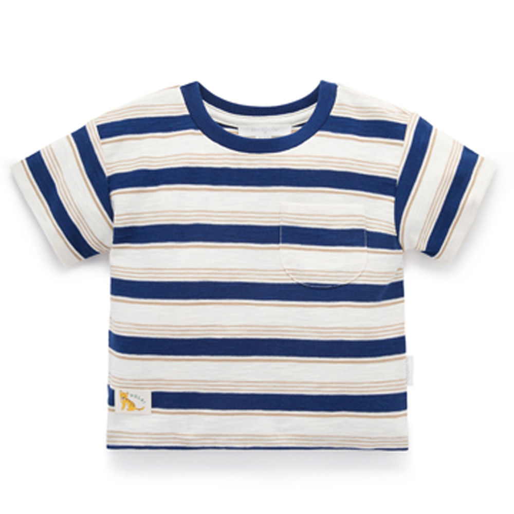 【產品描述】 ◆採用有機棉,安心材質 ◆羅紋領口飾邊,不易變形 ◆寬鬆版型,胸前小口袋,經典條紋設計