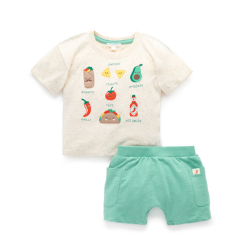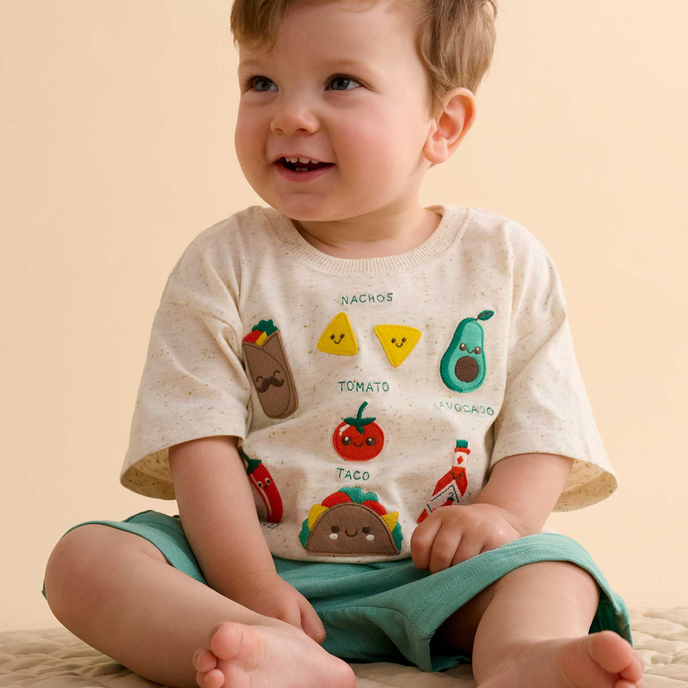 【產品描述】 ◆採用100%有機棉,安心材質 ◆趣味十足的墨西哥捲餅、玉米捲等貼布繡上衣 ◆側口袋和低襠設計的短褲,舒適有彈性 ◆超值套裝搭配,輕鬆打造夏日休閒風格