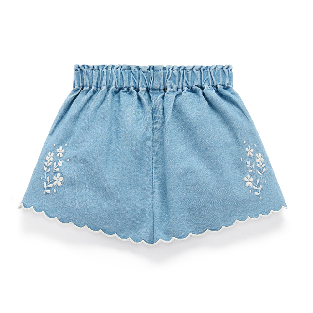 【產品描述】 ◆採用100%純棉,安心材質 ◆舒適柔軟透氣又好穿 ◆鬆緊腰帶,後口袋,側邊精美的花卉刺繡,漂亮的撞色扇形滾邊 ◆款式大方好搭配,打造夏日甜美造型