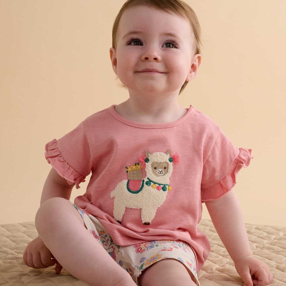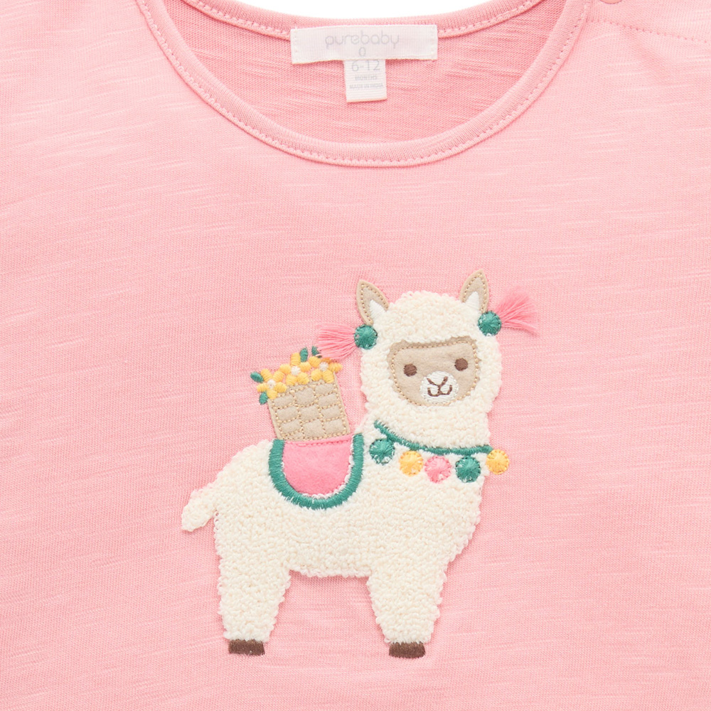 【產品描述】 ◆100%有機棉針織布料,質地略帶粗紡紋理 ◆安心面料 ,材質柔軟又舒適 ◆寬鬆A字版型,荷葉袖 ◆胸前可愛羊駝貼布繡