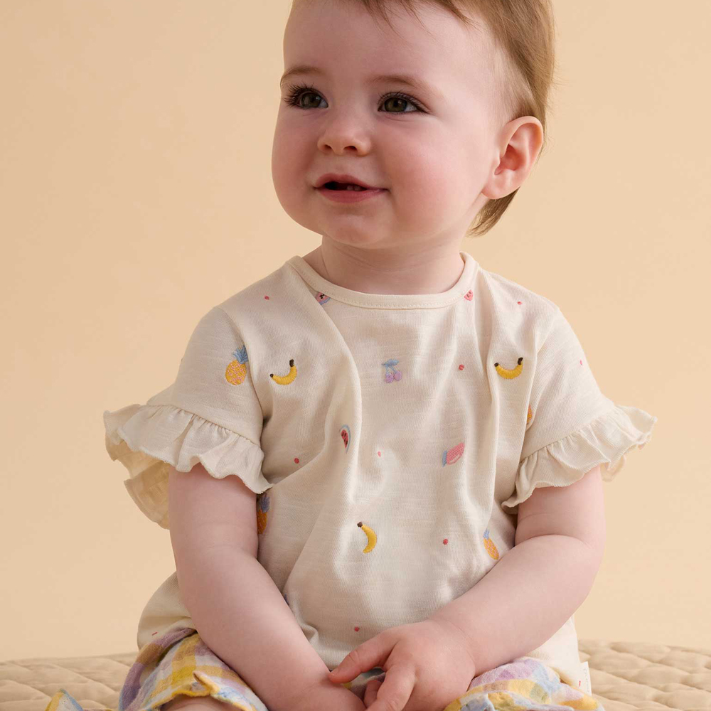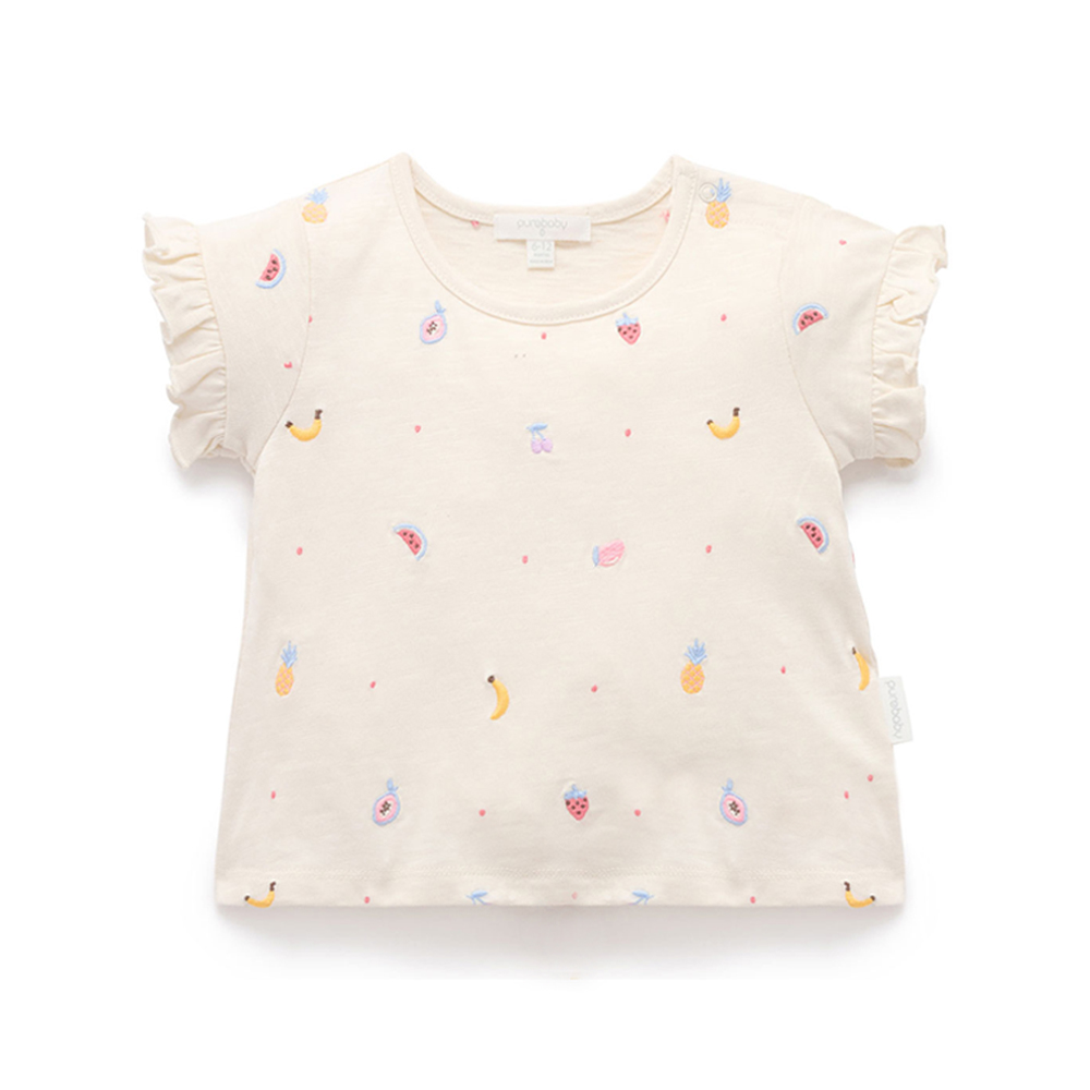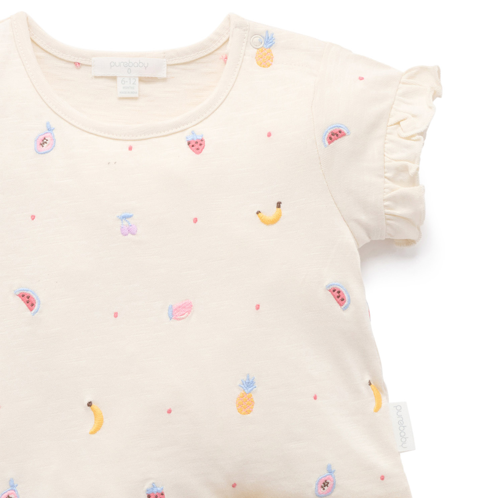 【產品描述】 ◆100%有機棉布製成,安心面料 ,材質柔軟又舒適 ◆寬鬆版型,袖口有荷葉滾邊 ◆全身飾有精美熱帶水果刺繡