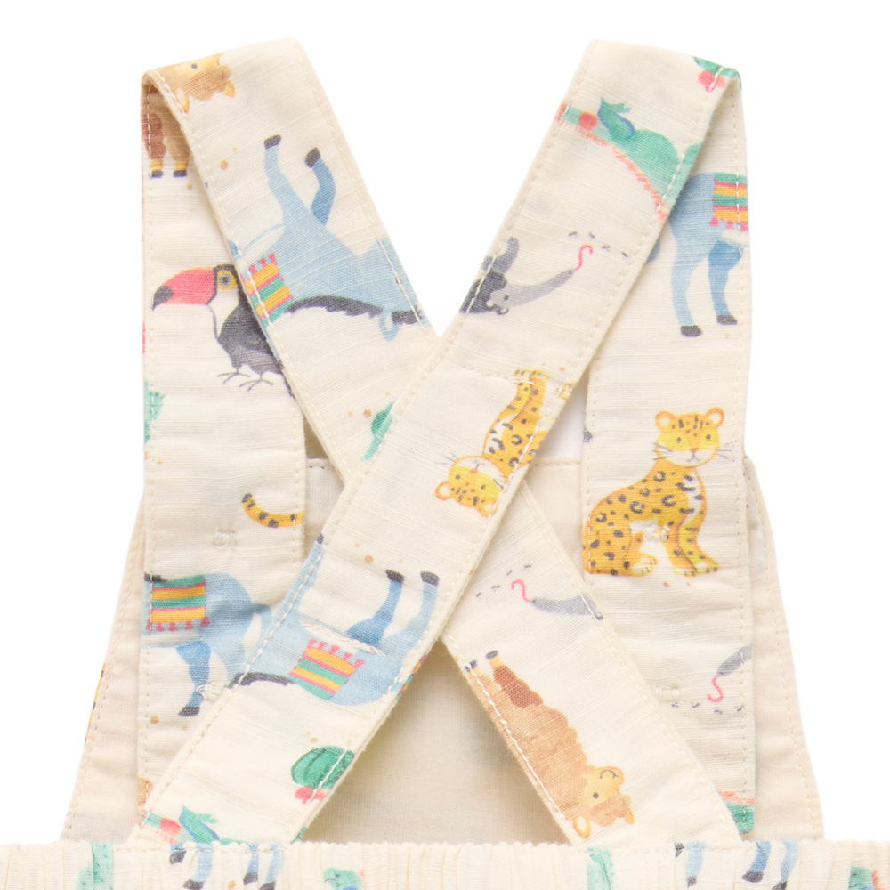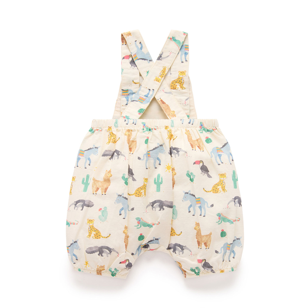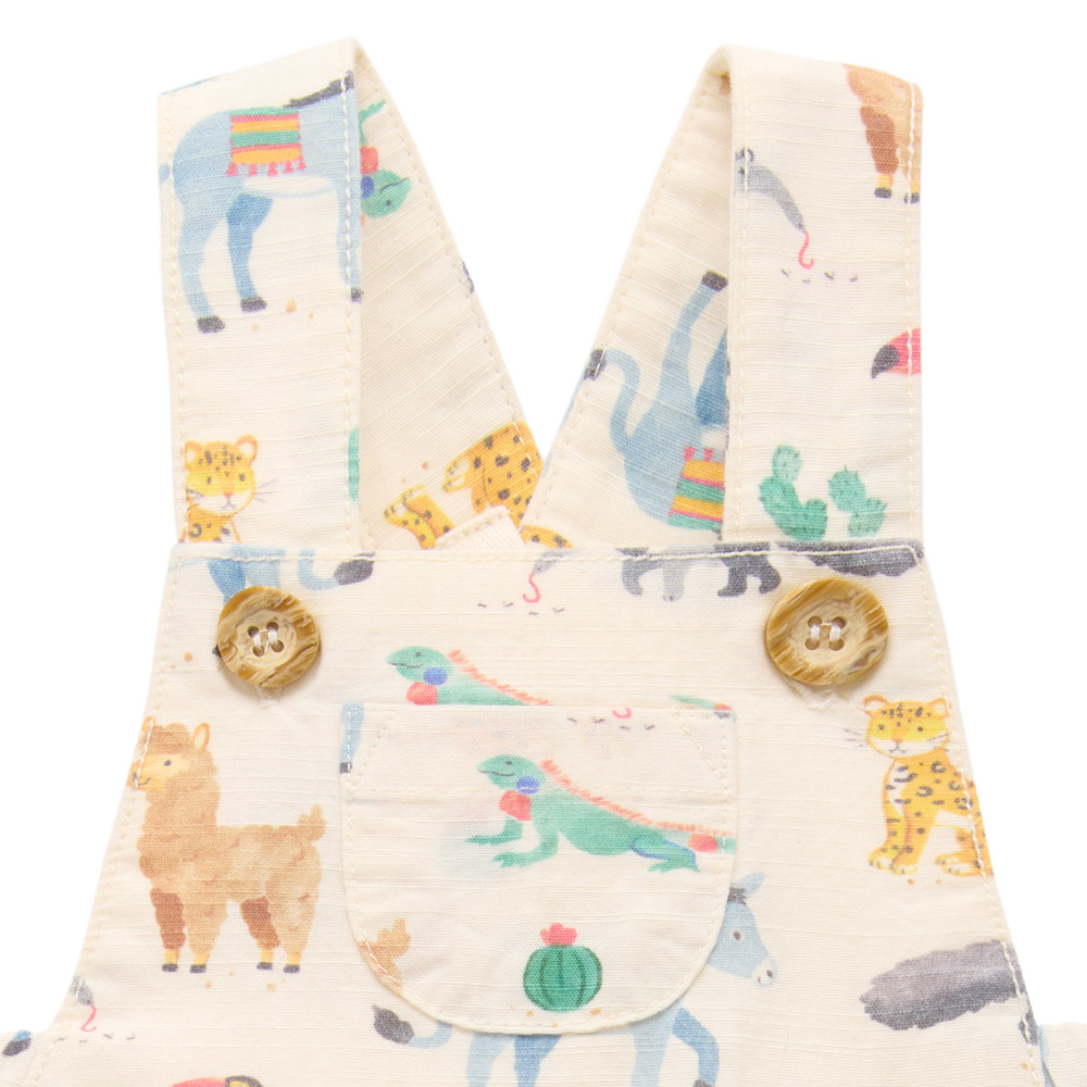 【產品描述】 ◆採用 100% 有機棉製成,安心材質 ◆柔軟舒適又好穿;呵護寶寶細緻肌膚 ◆仿木鈕扣,可調式交叉肩帶,胸前有可愛小口袋 ◆腿部和腰部鬆緊飾邊,褲腿上有按扣,方便穿脫 ◆全身水彩南美動物印花,活潑可愛