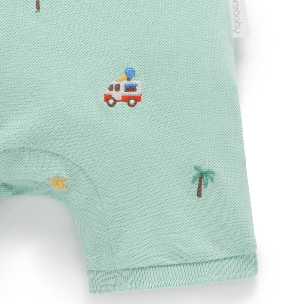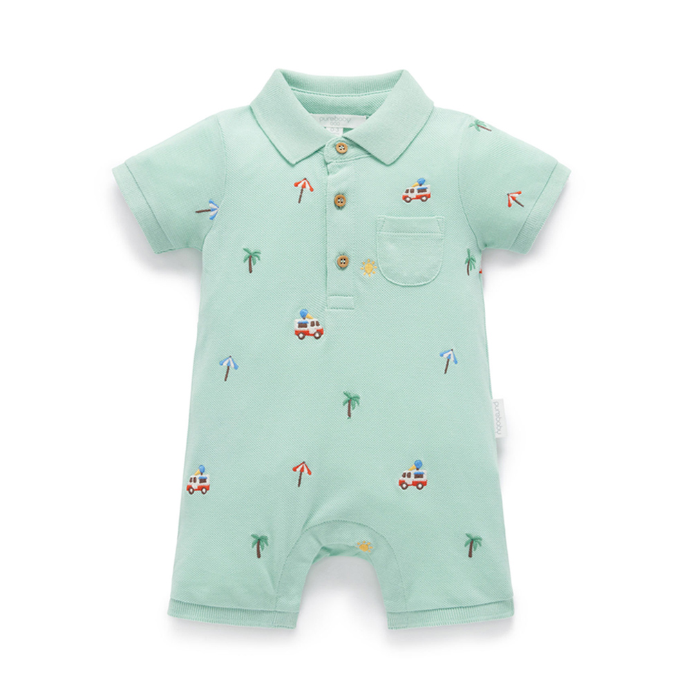 【產品描述】 ◆採用有機棉, 材質使用最安心 ◆舒適柔軟透氣, 呵護寶寶細緻肌膚 ◆POLO衫式連身衣,胸前的木質扣,腿部按扣式,方便穿脫 ◆羅紋領和袖口,胸前小口袋,可愛沙灘主題刺繡