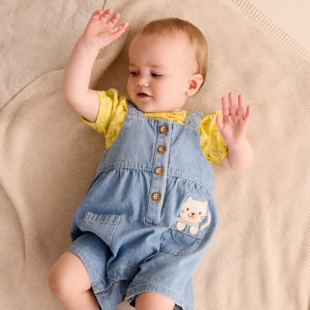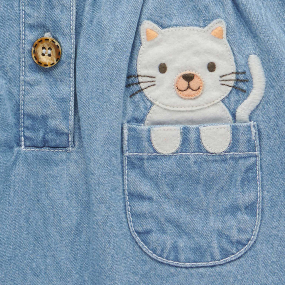 【產品描述】 ◆採用有機棉,安心材質 ◆柔軟舒適,呵護寶寶細緻肌膚 ◆碎花上衣,可調式肩帶牛仔吊帶褲 ◆褲管內有按扣,方便穿脫 ◆口袋裡可愛貓咪貼花