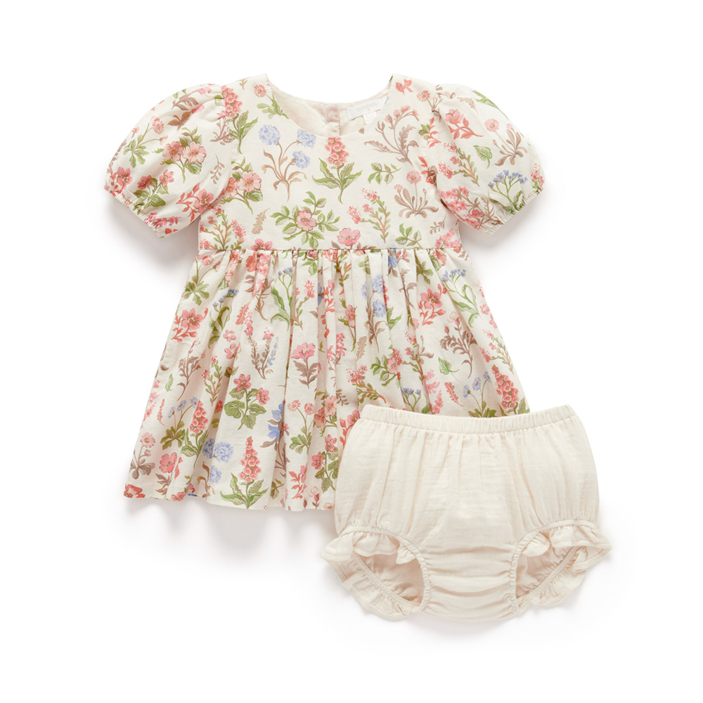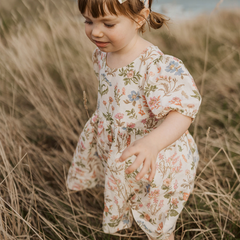 【產品描述】 ◆採用有機棉, 安心面料 ◆混紡亞麻透氣柔軟,公主泡泡袖 ◆花卉印花,背面有仿木鈕釦方便穿脫 ◆ 尺寸1T有含荷葉邊燈籠褲