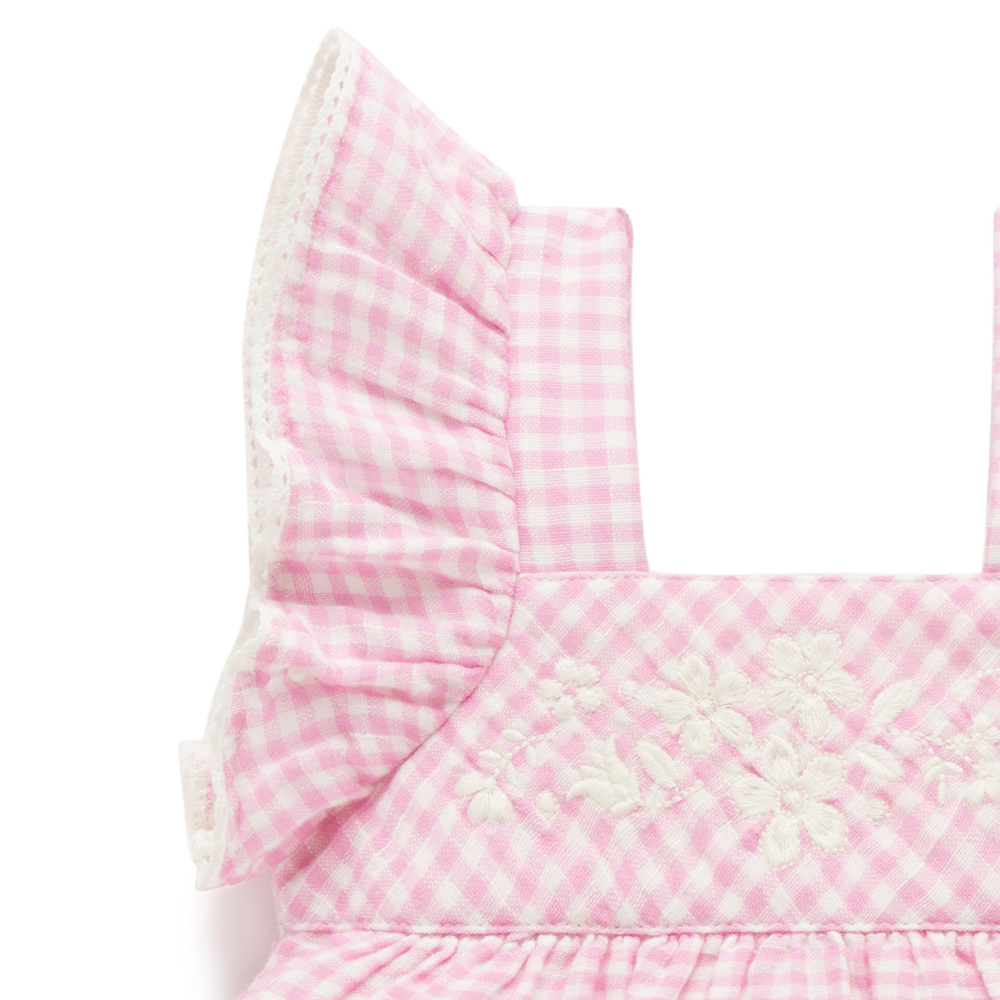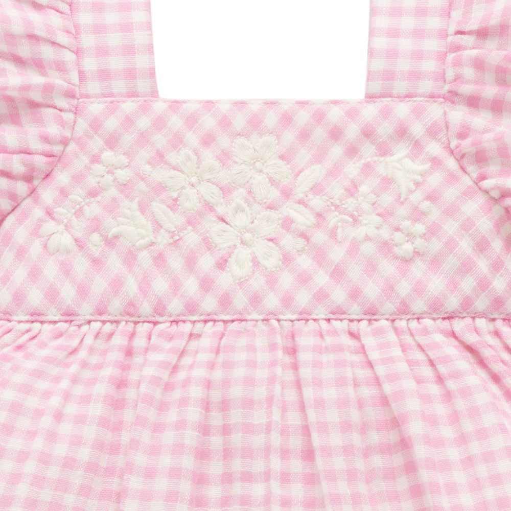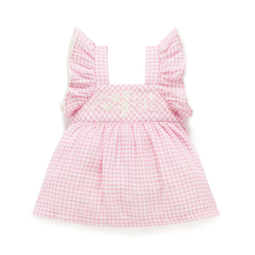 ◆採用最柔軟100%有機棉平紋細布製成 ◆輕盈且舒適,肩部荷葉袖設計搭配蕾絲飾邊 ◆背面有木質外觀羈扣,方便穿衣 ◆柔和粉色格子,胸部飾有花卉刺繡,柔美典雅