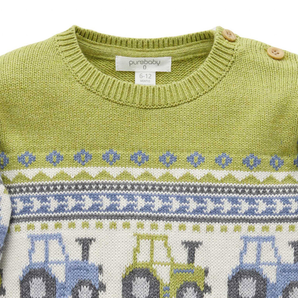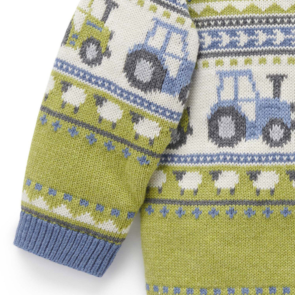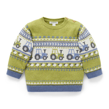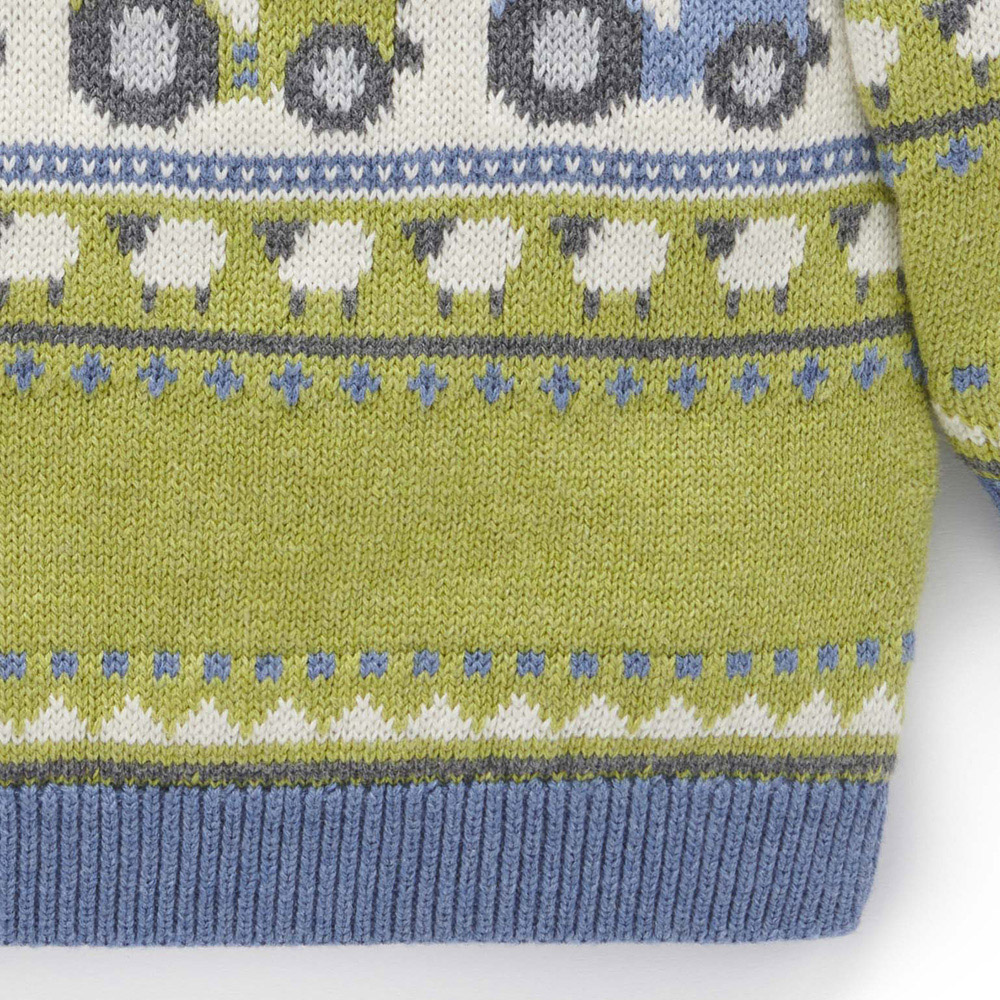 【產品描述】 ◆有機棉混紡羊毛,材質舒適柔軟又保暖 ◆肩部木質鈕扣方便穿脫 ◆袖口及下擺羅紋針織飾邊 ◆有趣農場拖拉機綿羊圖案