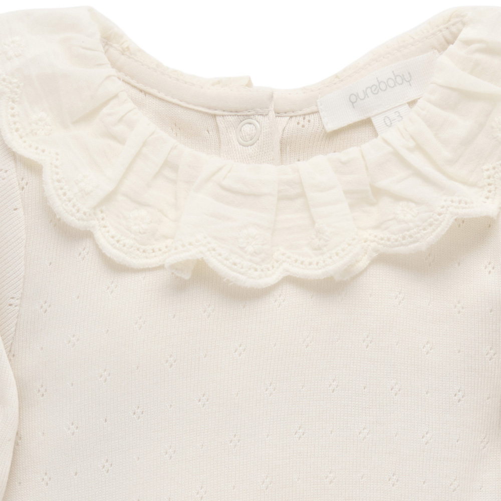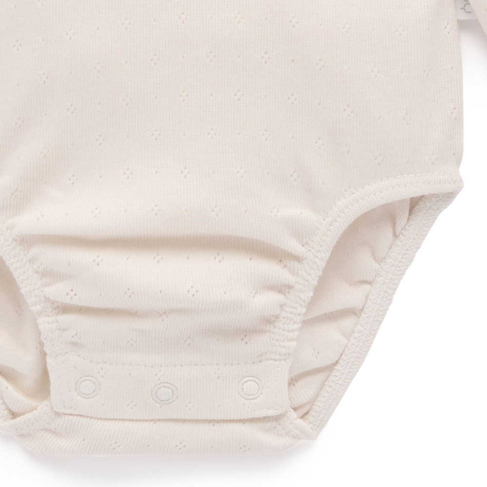 【產品描述】 ◆採用100%有機棉安心面料 ◆舒適柔軟透氣,呵護寶寶細緻肌膚 ◆腿部和肩部有暗扣,方便穿脫 ◆全身透氣孔眼,甜美扇貝形荷葉領