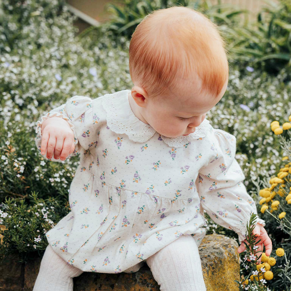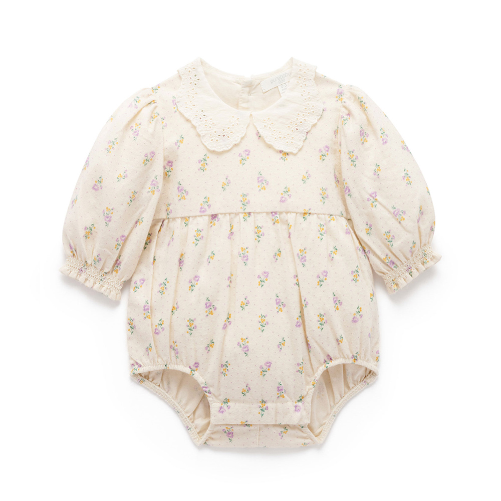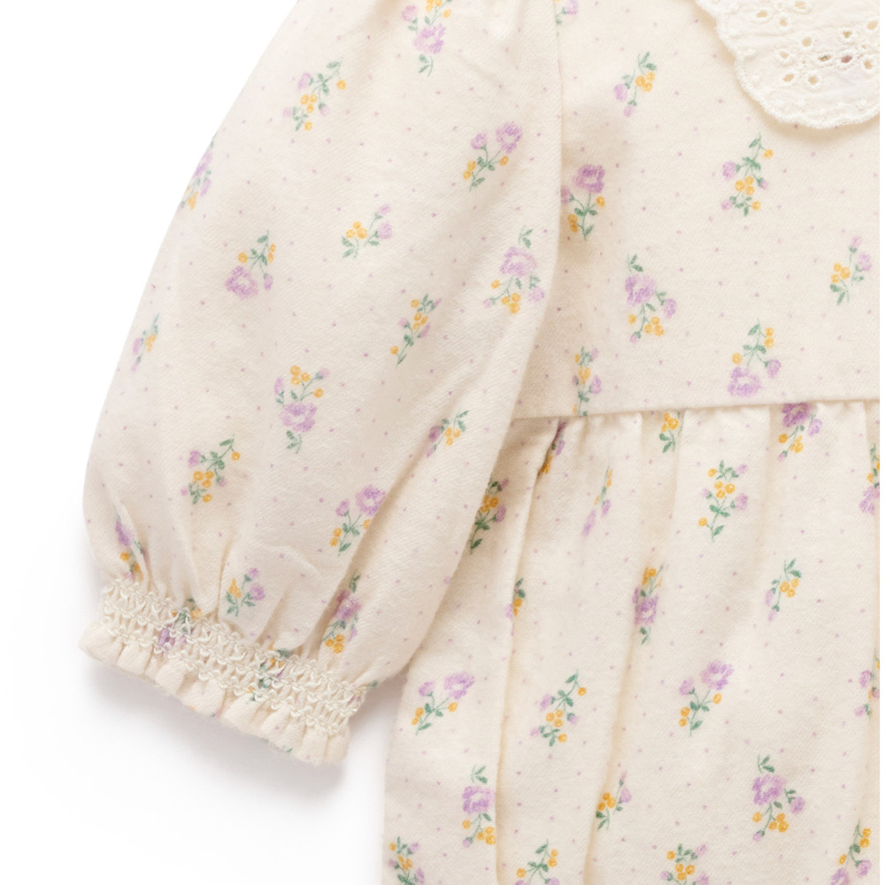 【產品描述】 ◆100% 有機棉法蘭絨製成,材質使用最安心 ◆漂亮的蕾絲領片,胸部褶皺設計 ◆腿部和袖口採用鬆緊設計,褲檔有按釦,方便穿著 ◆漂亮櫻草花卉印花,典雅大方