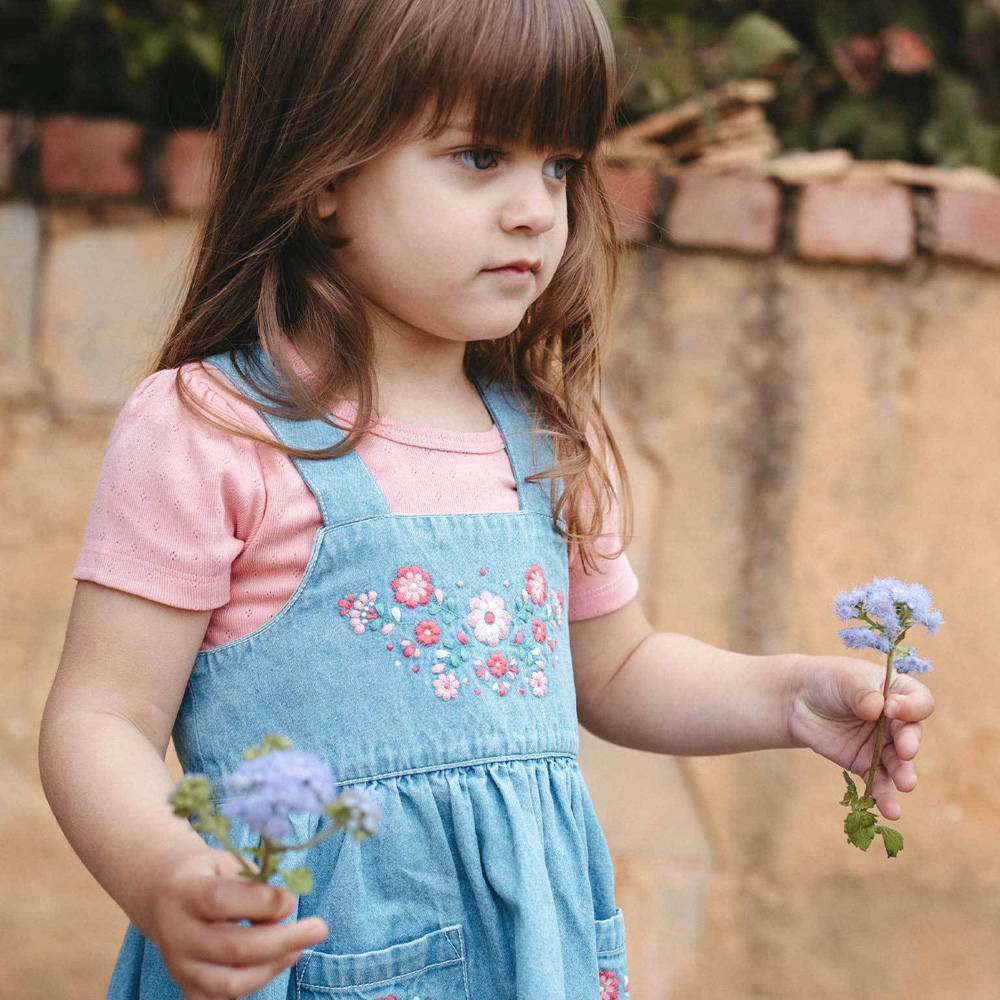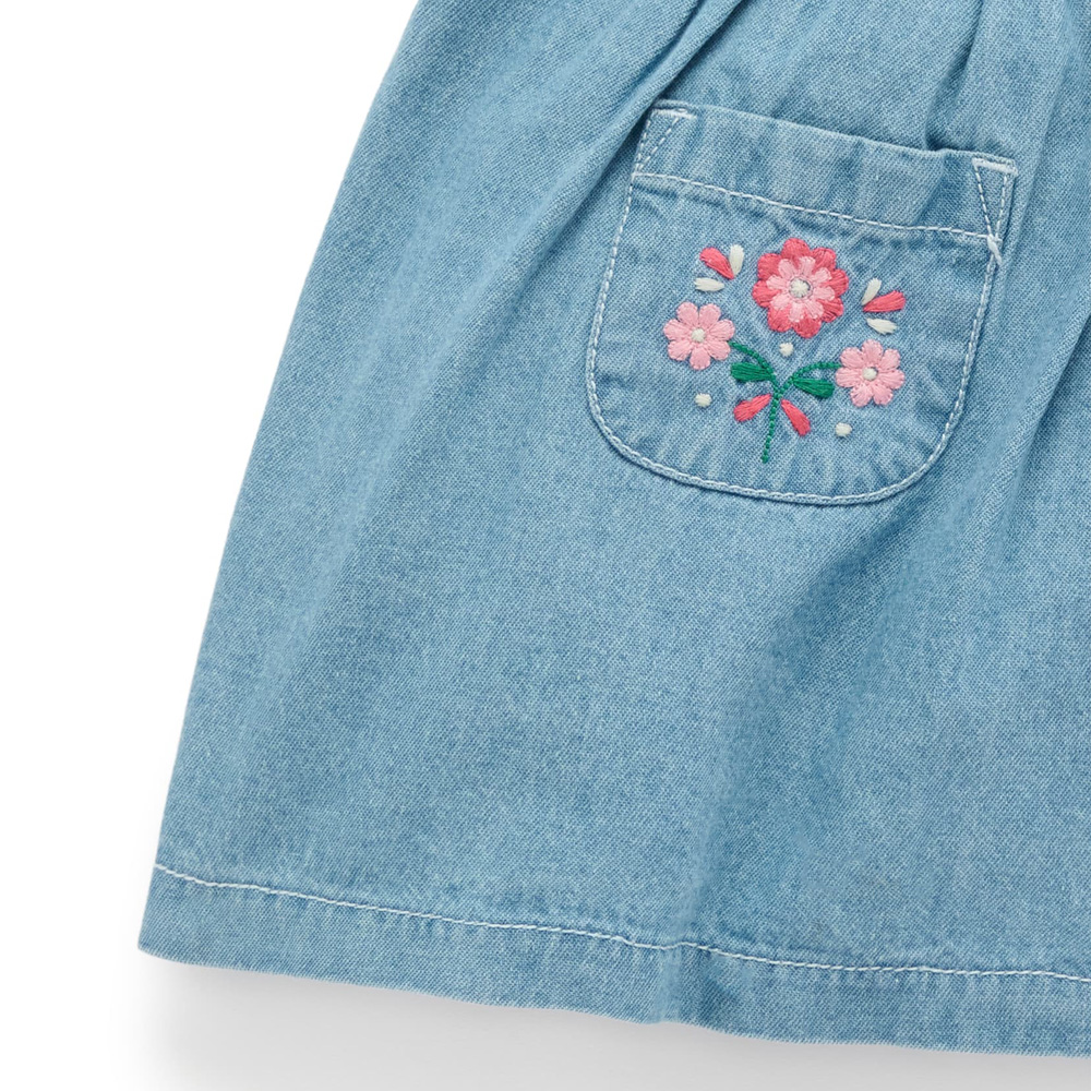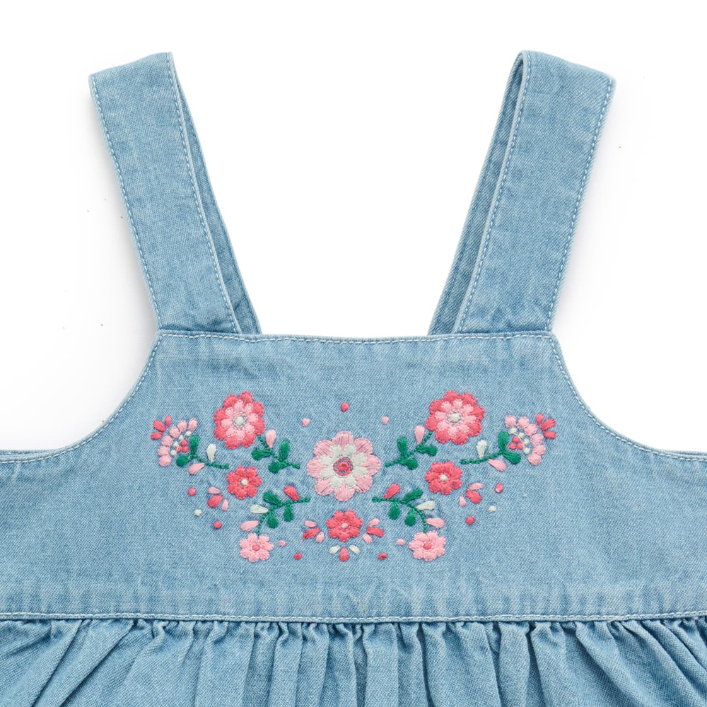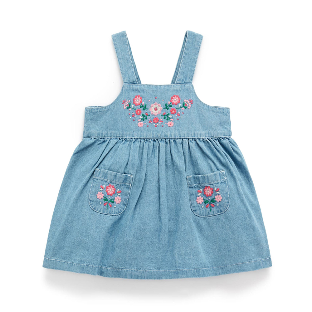 【產品描述】 ◆100% 純棉牛仔布製成,安心材質 ◆精緻甜美花卉刺繡,背部可調節仿木鈕扣,拉鍊方便穿脫 ◆前擺雙口袋,胸前及口袋上有精緻繡花 ◆材質柔軟,實穿好搭配,是適合跨季節天氣的多功能單品