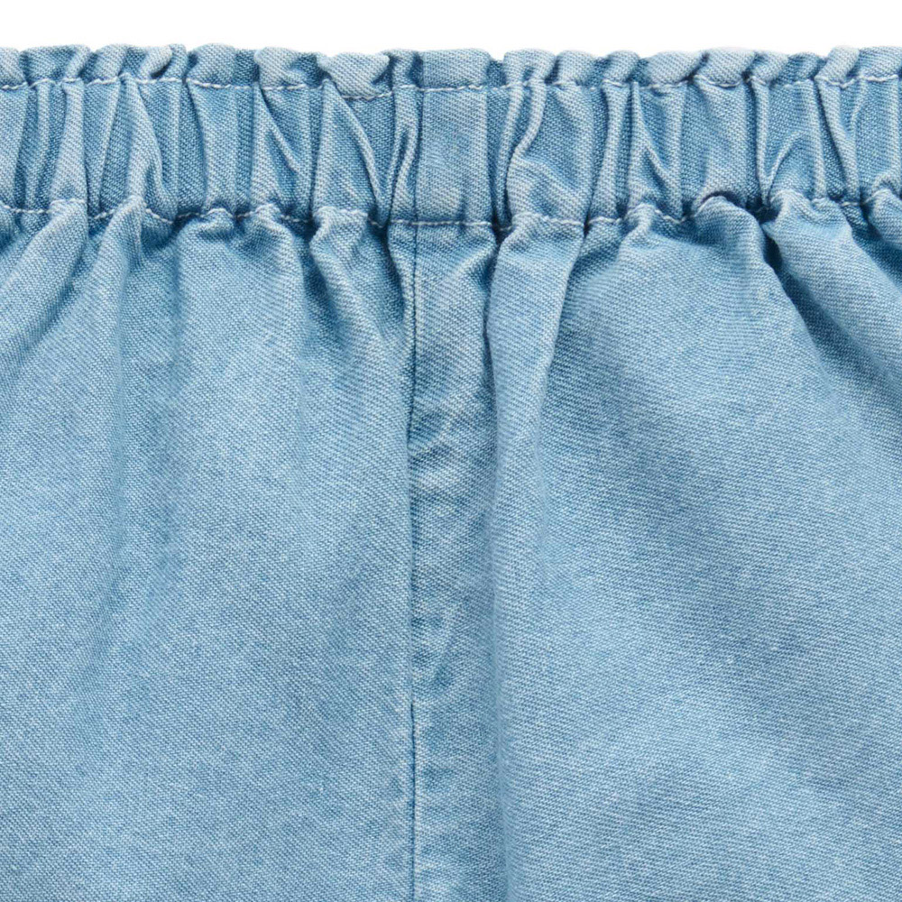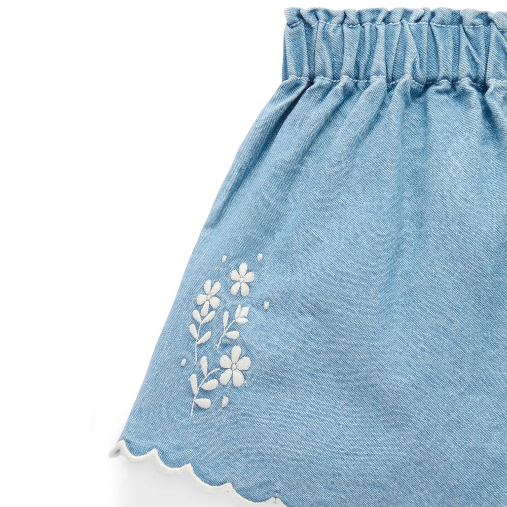 【產品描述】 ◆採用100%純棉,安心材質 ◆舒適柔軟透氣又好穿 ◆鬆緊腰帶,後口袋,側邊精美的花卉刺繡,漂亮的撞色扇形滾邊 ◆款式大方好搭配,打造夏日甜美造型
