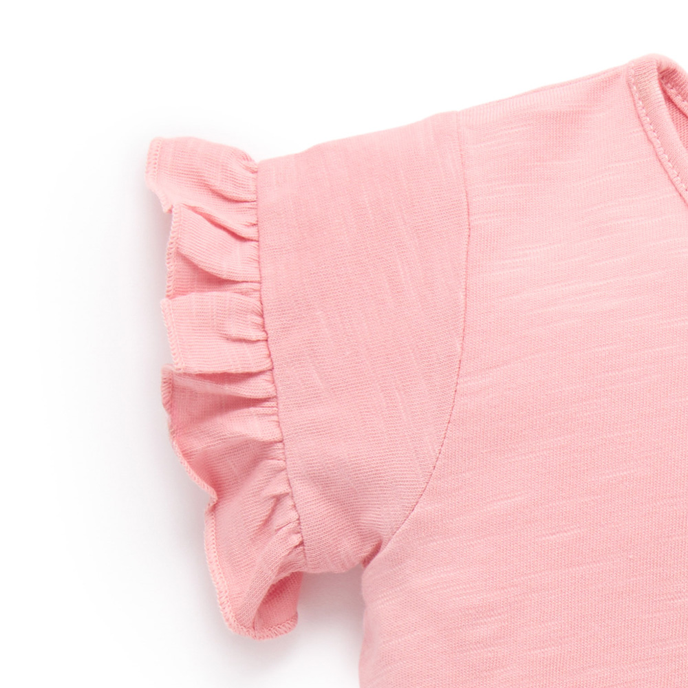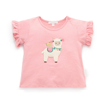 【產品描述】 ◆100%有機棉針織布料,質地略帶粗紡紋理 ◆安心面料 ,材質柔軟又舒適 ◆寬鬆A字版型,荷葉袖 ◆胸前可愛羊駝貼布繡
