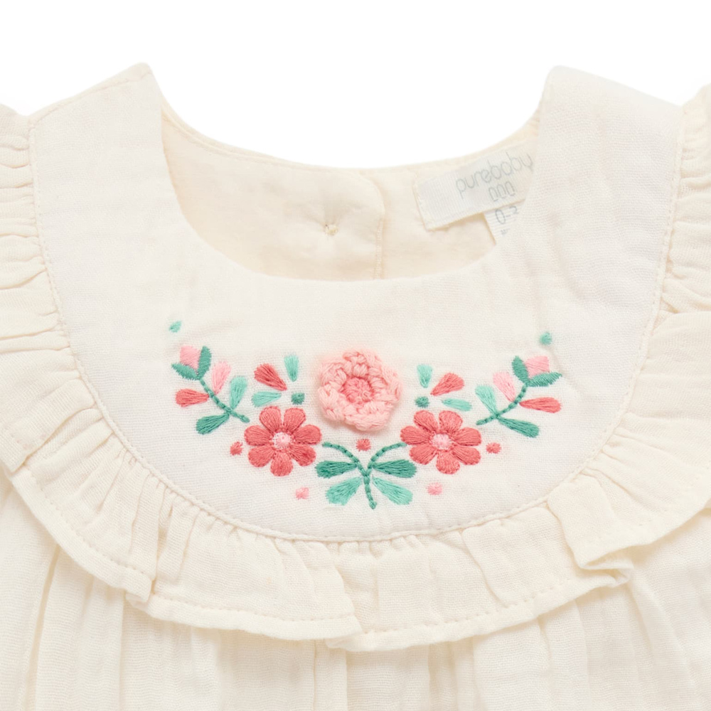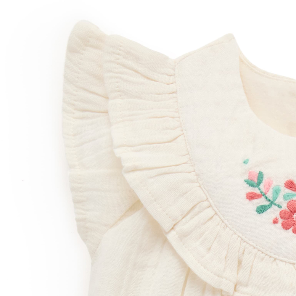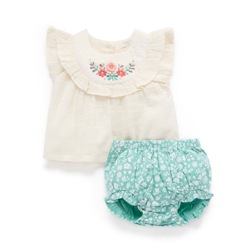 【產品描述】 ◆採用有機棉紗布,安心材質 ◆甜美荷葉邊花卉刺繡上衣+荷葉邊燈籠褲 ◆上衣寬鬆型,胸前飾有荷葉邊,精緻花朵刺繡,活潑甜美 ◆腿部和腰部鬆緊飾邊的燈籠褲,穿著舒適 ◆套裝搭配,輕鬆打造夏日甜美風格