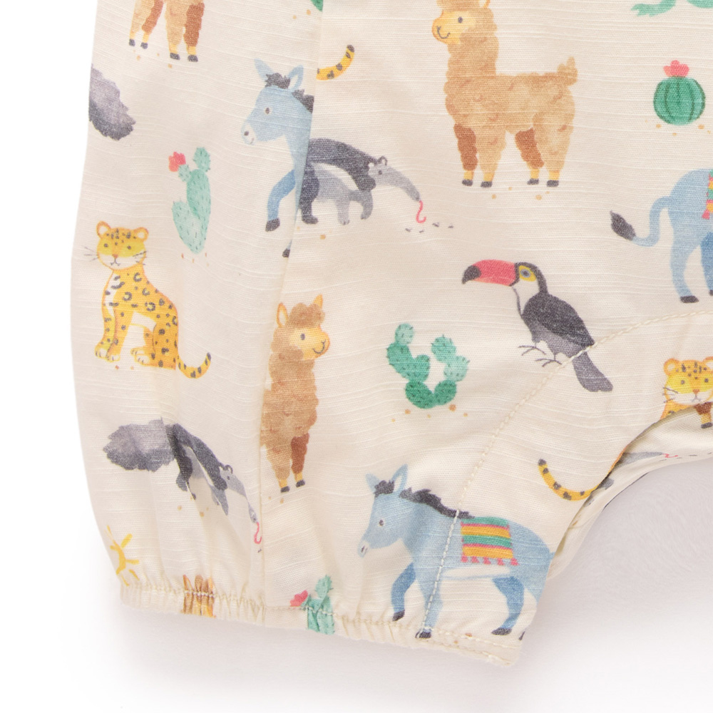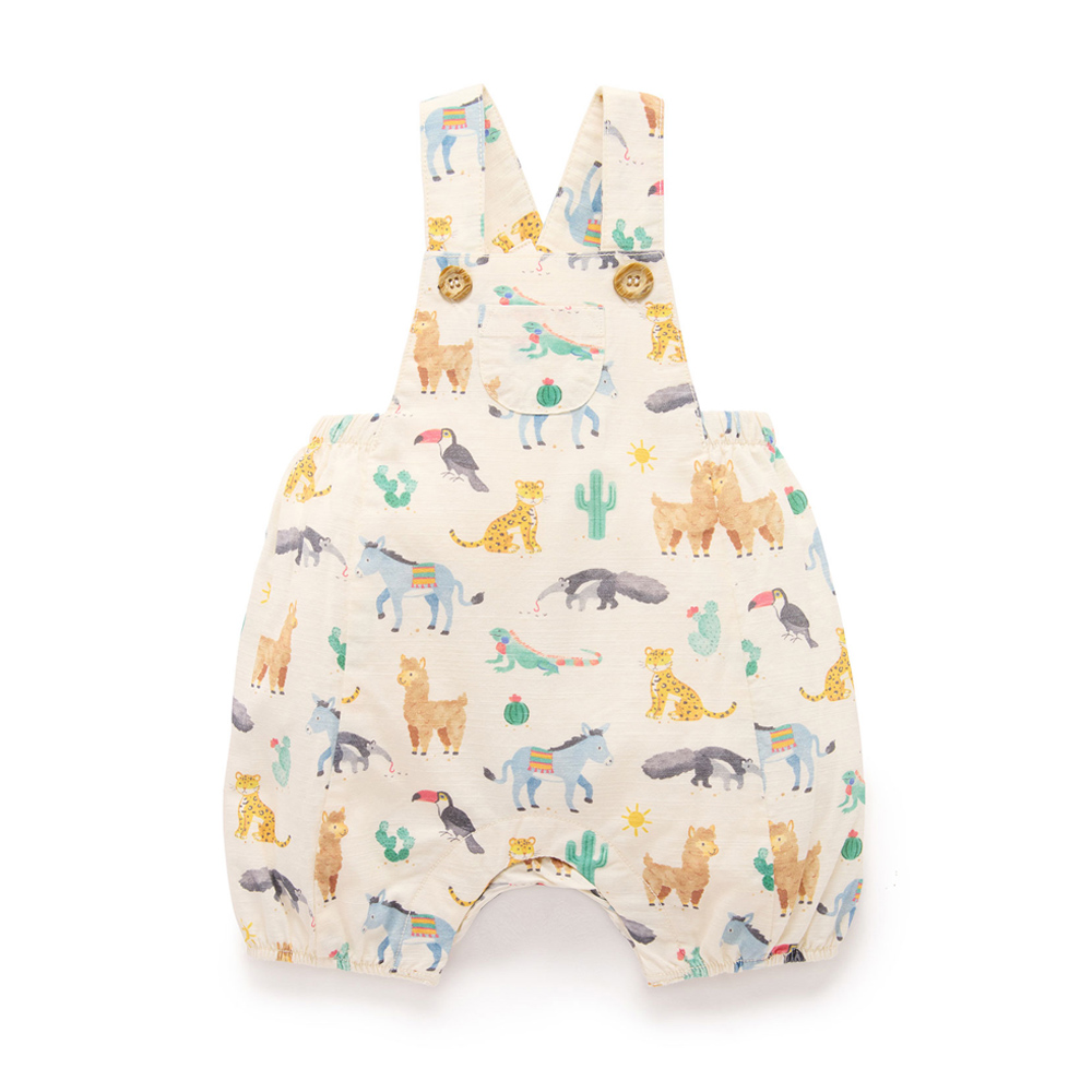 【產品描述】 ◆採用 100% 有機棉製成,安心材質 ◆柔軟舒適又好穿;呵護寶寶細緻肌膚 ◆仿木鈕扣,可調式交叉肩帶,胸前有可愛小口袋 ◆腿部和腰部鬆緊飾邊,褲腿上有按扣,方便穿脫 ◆全身水彩南美動物印花,活潑可愛