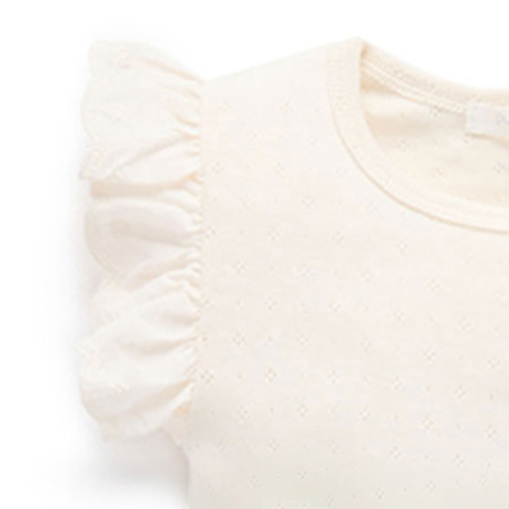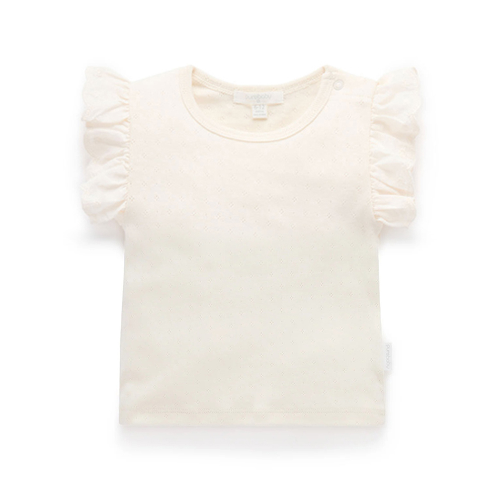 【產品描述】 ◆100%有機棉,材質柔軟又舒適 ◆甜美荷葉邊袖,簡單素雅 ◆純白素T,輕鬆打造甜美舒爽的夏日造型