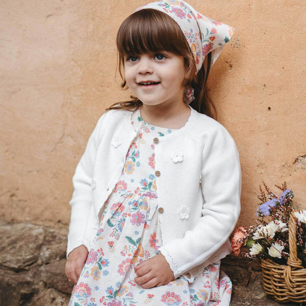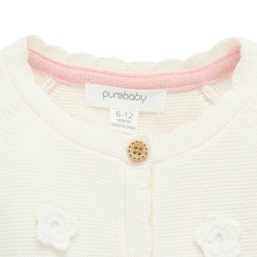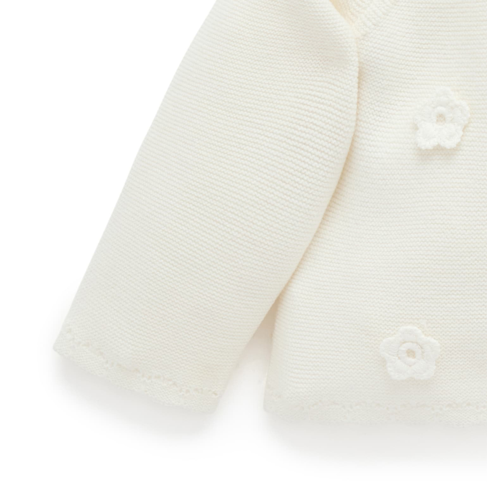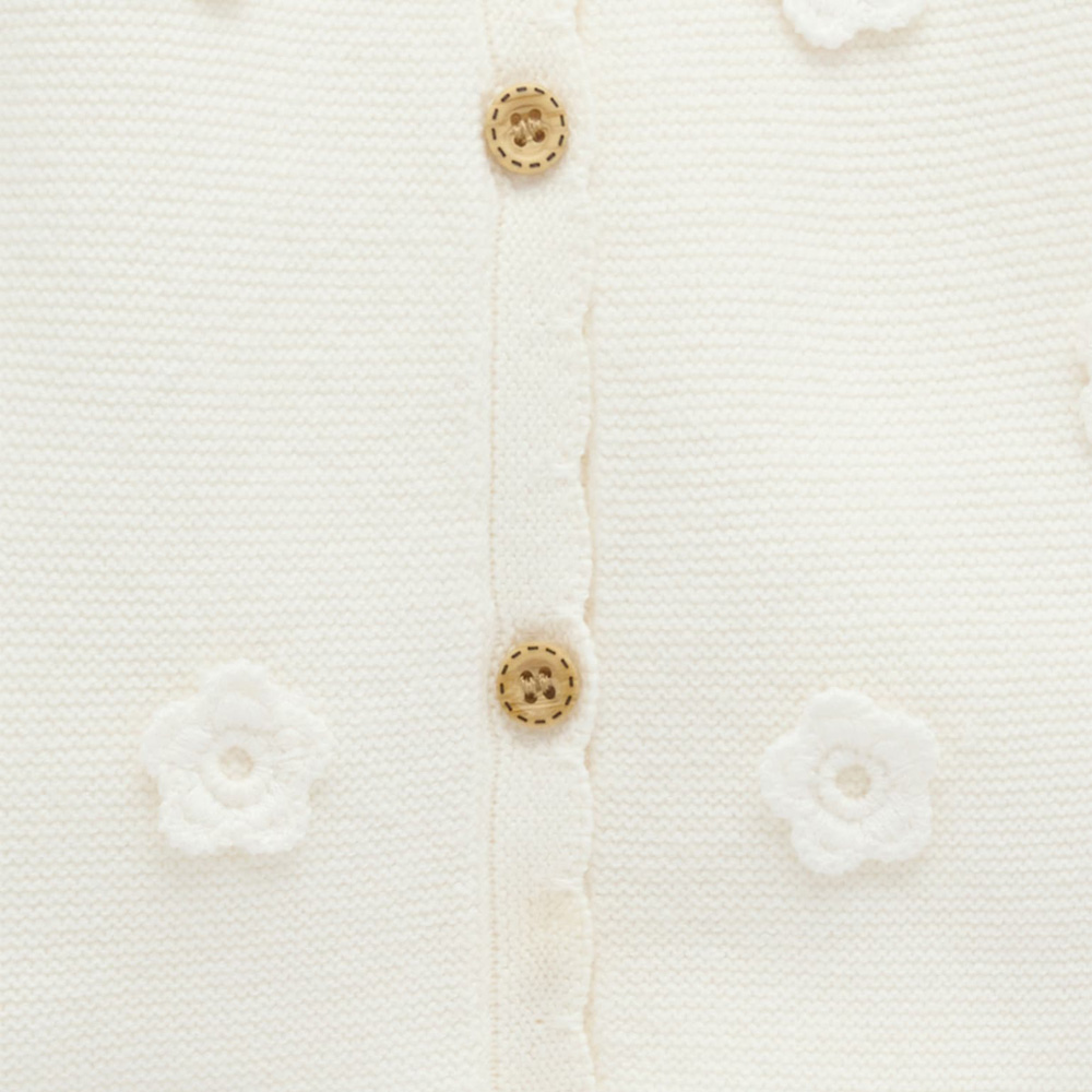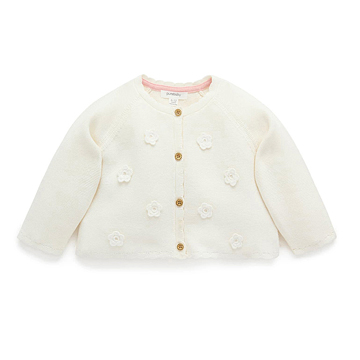 【產品描述】 ◆採用有機棉,材質柔軟舒適 ◆扇形袖口及下擺,仿木鈕扣,方便穿脫 ◆純白色,胸前飾有甜美的立體鈎針花朵, 非常適合換季及冷氣房搭配的單品