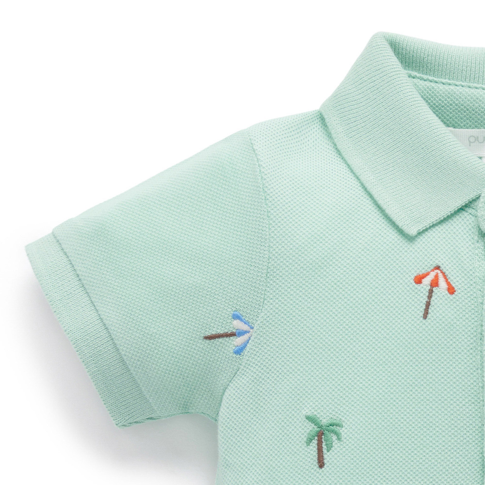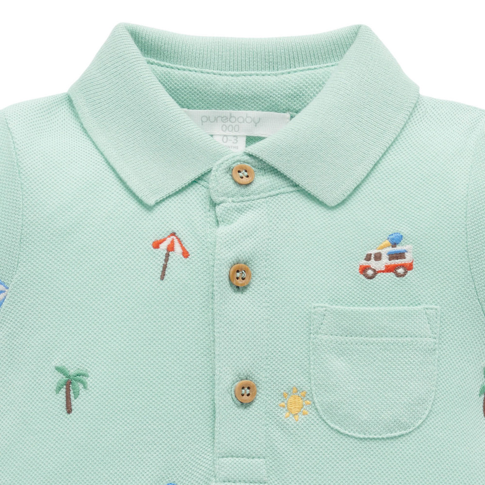 【產品描述】 ◆採用有機棉, 材質使用最安心 ◆舒適柔軟透氣, 呵護寶寶細緻肌膚 ◆POLO衫式連身衣,胸前的木質扣,腿部按扣式,方便穿脫 ◆羅紋領和袖口,胸前小口袋,可愛沙灘主題刺繡